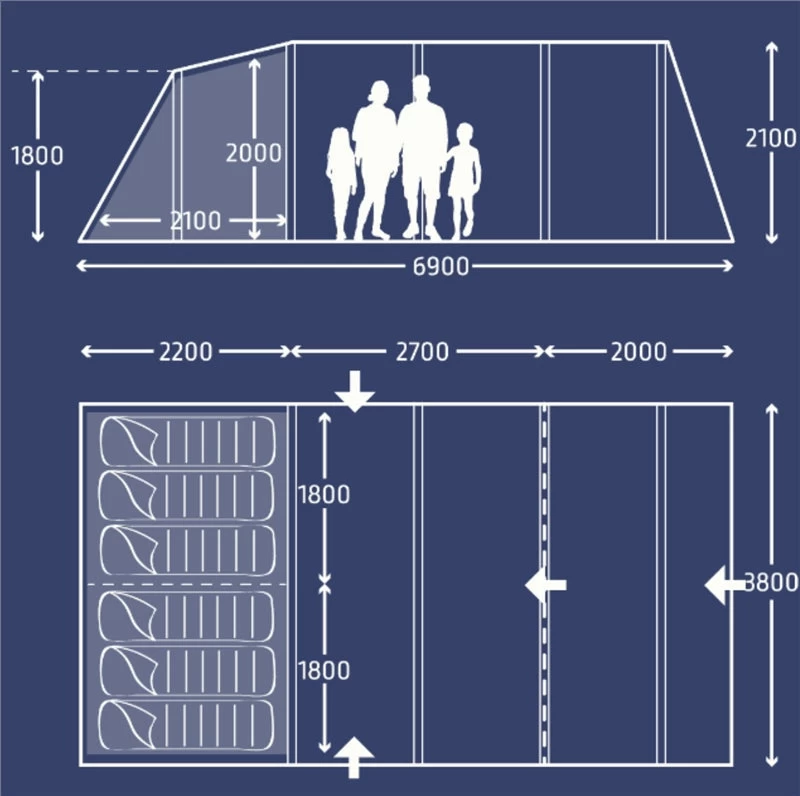 Kampa Hayling 6 Poled Tent 2021 Model – 3 section tunnel tent, spacious for the whole family.