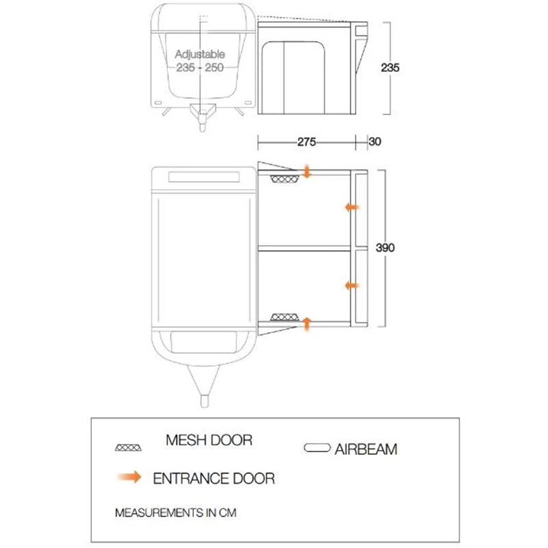 The Vango Riviera Air 390 Elements TC Caravan Awning Side Canopy and CP225 Breathable Fitted Carpet is the ultimate extension for your caravan, providing modern and timeless design in one. With the revolutionary AirBeam® S.I Pro single point inflation and Multi-Point Deflation, this inflatable awning ensures a smooth and easy setup and takedown every time. Made with highly durable Elements TC fabric, this awning is able to withstand even the harshest weather conditions, while showcasing superior features such as Diamond Pro Windows for clear views and insulation, multi-zip privacy curtains, a SkyLiner for reducing condensation, and zipped external window covers. Perfect for touring in various climates, the Riviera also offers an optional annex for extra storage or guests, making it ideal for family trips. Experience a luxurious and home-like atmosphere on the campsite with the Vango Riviera Air 390.