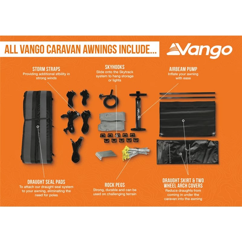 Two Carry Bags – For easier storage, transport and packing we have split this awning into two bags, one for the main structure of the awning and one for all the included extras such as Draught Skirt, Wheel Arch Covers, Pegs, Pump, Storm Straps, Bracer Beams*(*Model Specific)