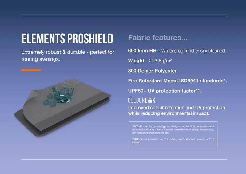 - Elements ProShield – Robust, durable and waterproof. 300D fabric with an HH rating of 6,000MM. Benefits from ColourLok™ technology to aid colour retention.